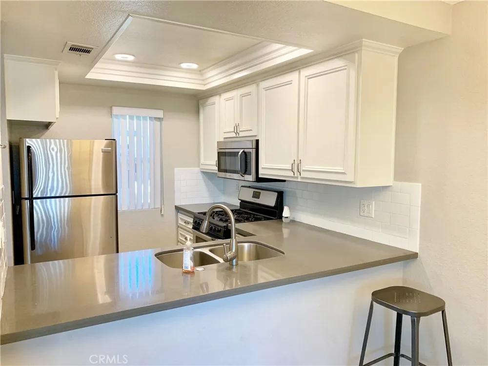 Super sharp single-story condo with 2 bedrooms with walk-in closets and 2 bathrooms, spacious family room, separate dining room located in the quiet Park Vista Community. No neighbors above or below you! This condo has been completely renovated with laminate flooring, tile, white cabinets, stainless steel appliances, quartz counters, dual pane windows and beautiful neutral colors throughout. It also features a breakfast bar, vaulted ceilings in the family room, slider to enclosed back patio, large, indoor laundry room. Conveniently located near the 60 and 10 freeways, shopping, restaurants and many amenities. Single car garage and one covered carport included. Rent includes water and trash, COMMUNITY POOL & SPA. come see this home today...YOU'LL BE GLAD YOU DID.
