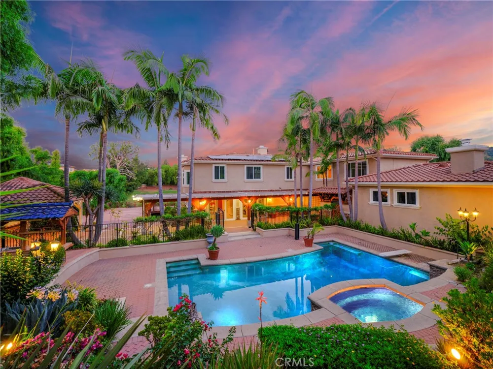 Absolutely Gorgeous custom built property in Chino Hills. This executive estate has 5 bedrooms, 4.5 bathrooms (1 bedroom 1.5 bathroom downstairs), plus library upstairs, entertainment room downstairs, 4 car garage. Drive in from the automatic security gate, you will be welcomed by the mini creek. Front double-door with stained glass panels, grand entry with cathedral ceiling. Super large living room with fireplace, formal dining room with custom chandelier. Gourmet kitchen with granite counter tops, center island, walk-in pantry, stainless-steel appliances including built-in Sub-Zero refrigerator, KitchenAid built-in microwave, oven, and dishwasher. Expansive family room. Primary bedroom with retreat area, fireplace, extra large walk-in closet with organizers, private balcony overviewing the 7th green, luxury master bathroom with dual sinks, free-standing bathtub and large shower with frameless glass enclosures. Home library with coffered ceiling, built-in book shelves. Upstairs laundry room with sink and plenty of cabinets. The downstairs guest suite with totally remodeled bathroom. The entertainment zone with wet bar is another highlight. Other features include: marble floor at the entry, tiles floor in kitchen, wood floor in the living room and bedrooms, custom two-tone paint, custom window draperies and shutters. The whole house plumbing system was re-piped. The 40,210 square feet lot has everything you desire, entertaining back yard with gazebo, built-in BBQ island, fire pit, swimming pool & spa, water fall, super large vinyl deck, lots of fruit trees, palms, and flowers. Enjoy the panoramic golf course and hills views. Prestigious gated Western Hills Estate community.