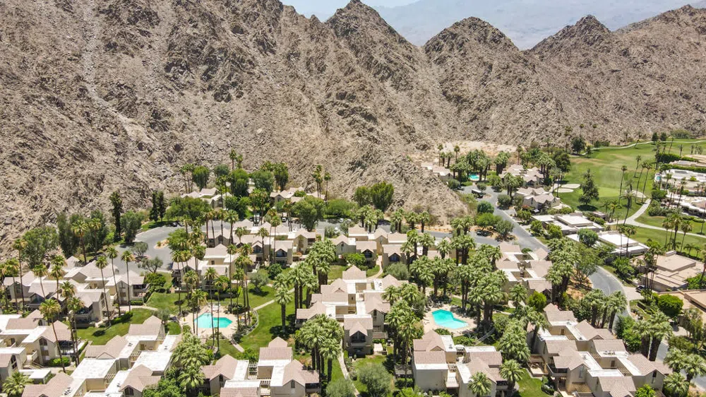 Majestic Mountain Views in this community! Tucked into the mountains adjacent to the Indian Wells CC. is Mountain Cove, FEE LAND not leased. for this Condo. A Cozy Condo just waiting for you. This one bedroom, bottom floor condo, feels larger than it is. If you are looking for a vacation get-away, permanent residence or rental property, come see this beauty. Offered Turnkey Furnished per inventory list. Filled with natural light inside and an outdoor wrap-around patio for entertaining. The kitchen was tastefully remodeled with granite counters, cabinets, Bosch dishwasher, stainless refrigerator, Electric slide-in stove. The master bedroom is spacious and opens to a private patio. Check out the master bath which was also remodeled, dual vanity, granite counters, cabinets, lighting and a walk-in shower accented with glass water fall tiles. A second bath was also remodeled similar to the master bath. & includes a single sink vanity, stacked washer/dryer, also a closet. The patio off the living room has a cover shading the dining area & there is a storage area. This condo is steps away to a sparkling pool. A place to Play & Relax. The condo has a rental record and can be rented for a minimum of one week, buyer to verify rental status with the city. I W homeowners get a reduced rate at the public golf course, are close to the IW Tennis Gardens and to shopping on El Paseo. Opportunity is knocking don't miss out.